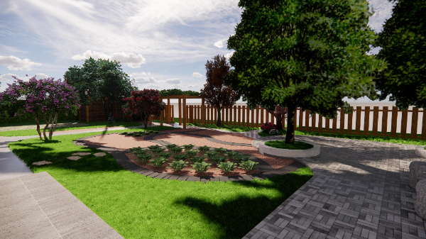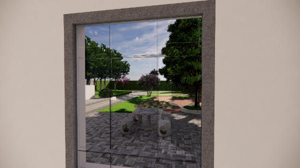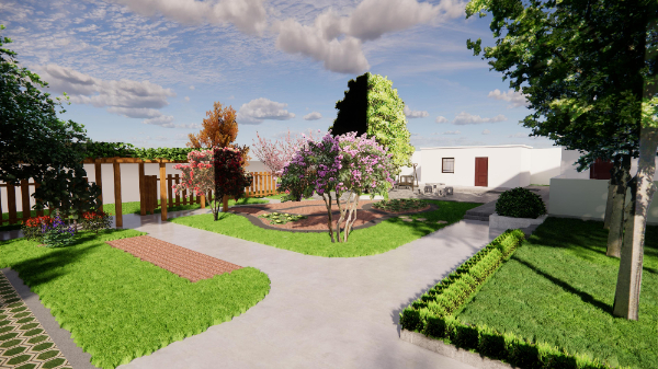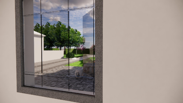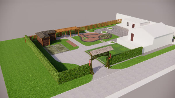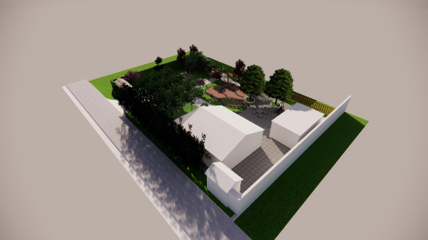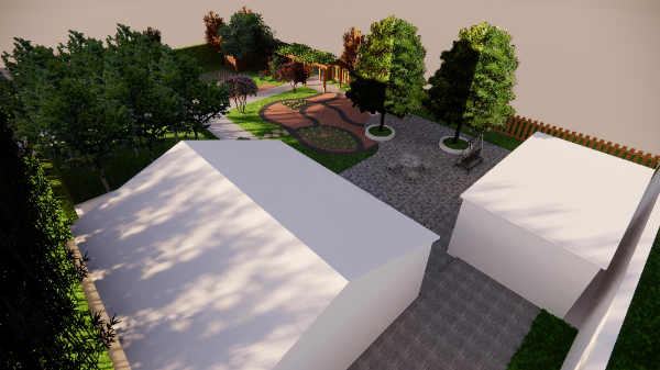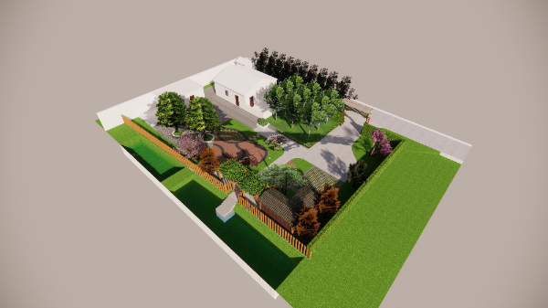 設(shè)計(jì)思路:在主體建筑的東側(cè),采用陣列的方式栽種9株中等落葉喬木,一是為了降低太陽(yáng)光對(duì)陽(yáng)光房的直射溫度,二是營(yíng)造貼近自然的生活環(huán)境,三也不會(huì)影響冬日的陽(yáng)光采集。在主體建筑的正南方,采用業(yè)主家多余的青磚進(jìn)行鋪地,使整個(gè)庭院的風(fēng)格更加的淳樸自然。