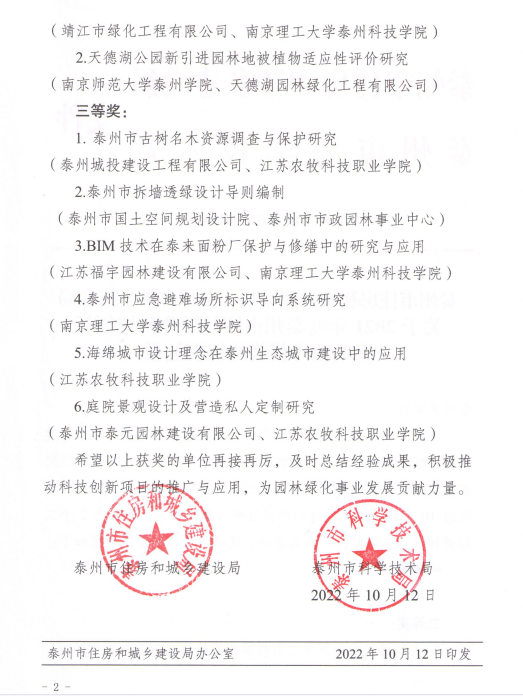 我公司庭院景觀項(xiàng)目獲得泰州市住建局、泰州市科技局園林綠化科技創(chuàng)新三等獎(jiǎng)